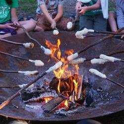 Kom naar het kampvuur. We gaan zelf broodjes bakken boven het vuur!